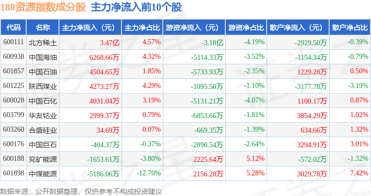 资金流向方面,180资源(000026)指数成份股当日主力资金净流出合计14.32亿元,游资资金净流出合计5.91亿元,散户资金净流入合计20.24亿元。成份股资金流向详情见下表: