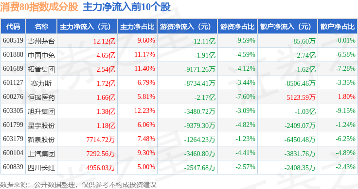 资金流向方面,消费80(000069)指数成份股当日主力资金净流入合计24.61亿元,游资资金净流出合计20.33亿元,散户资金净流出合计4.28亿元。成份股资金流向详情见下表: