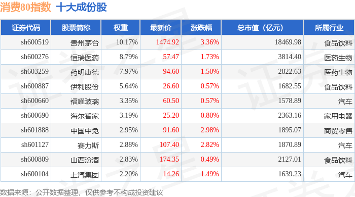 消费80(000069)指数十大成份股详情如下: