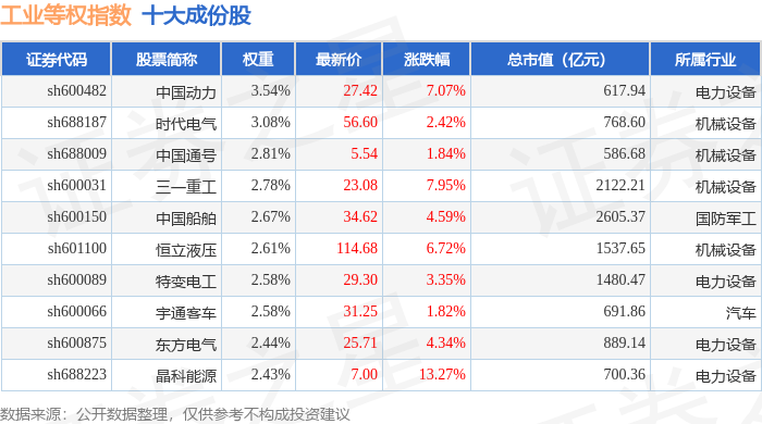 工业等权(000072)指数十大成份股详情如下:
