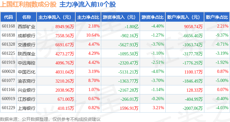 资金流向方面,上国红利(000151)指数成份股当日主力资金净流出合计3.48亿元,游资资金净流出合计1362.9万元,散户资金净流入合计3.62亿元。成份股资金流向详情见下表: