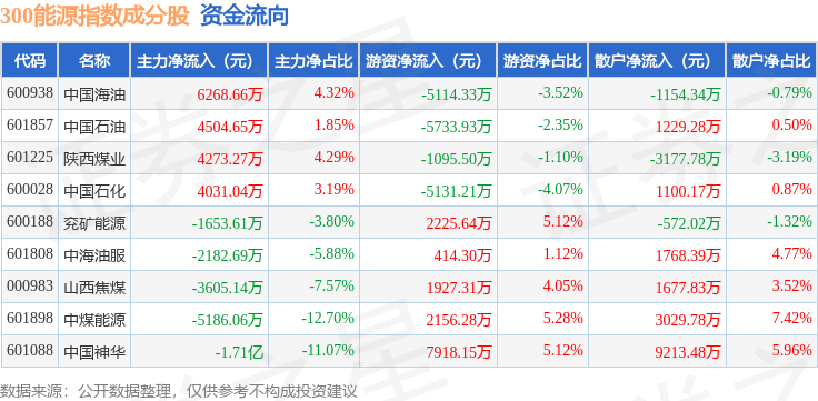 资金流向方面,300能源(000908)指数成份股当日主力资金净流出合计1.07亿元,游资资金净流出合计2433.29万元,散户资金净流入合计1.31亿元。成份股资金流向详情见下表: