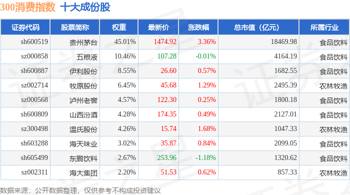 300消费(000912)指数十大成份股详情如下: