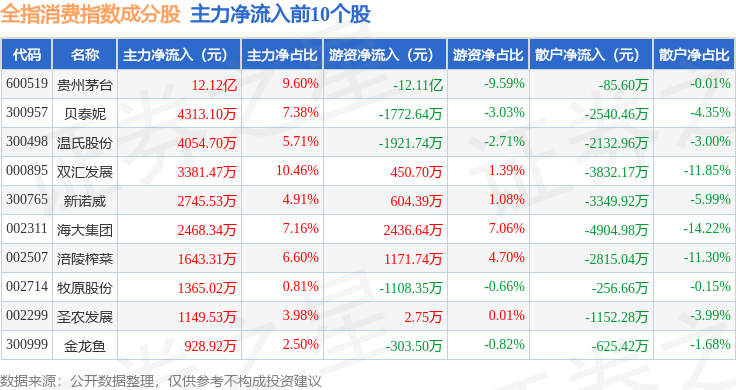 资金流向方面,全指消费(000990)指数成份股当日主力资金净流入合计3.19亿元,游资资金净流出合计10.65亿元,散户资金净流入合计7.45亿元。成份股资金流向详情见下表: