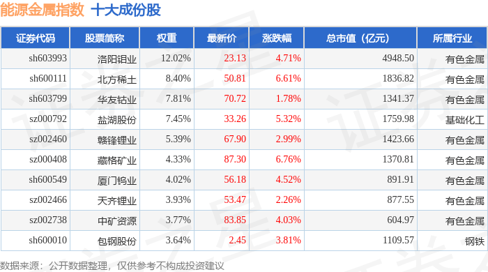 证券之星消息,2月3日,能源金属(399366)指数报收于2970.51点,涨4.41%,成交725.13亿元,换手率3.35%。当日该指数成份股中,上涨的有49家,中科磁业以10.12%的涨幅领涨,下跌的有1家,鹏欣资源以3.21%的跌幅领跌。
