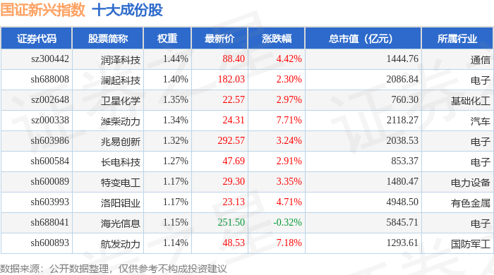 证券之星消息,2月3日,国证新兴(399392)指数报收于3076.2点,涨1.83%,成交3585.16亿元,换手率1.27%。当日该指数成份股中,上涨的有82家,晶科能源以13.27%的涨幅领涨,下跌的有17家,寒武纪以9.18%的跌幅领跌。