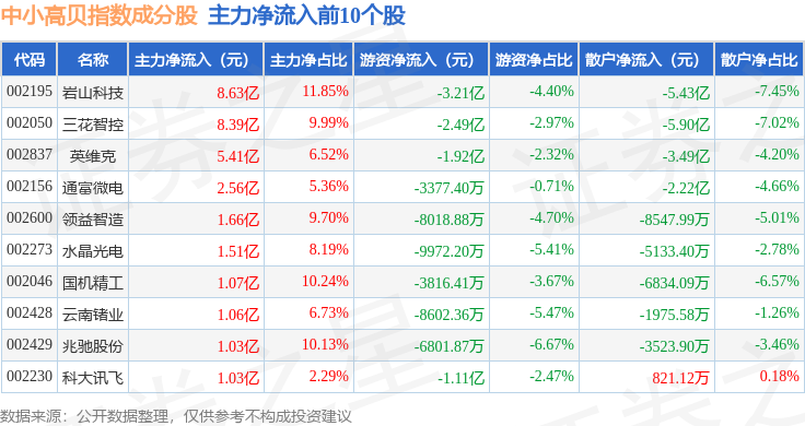 资金流向方面,中小高贝(399664)指数成份股当日主力资金净流入合计20.65亿元,游资资金净流出合计25.6亿元,散户资金净流入合计4.96亿元。成份股资金流向详情见下表: