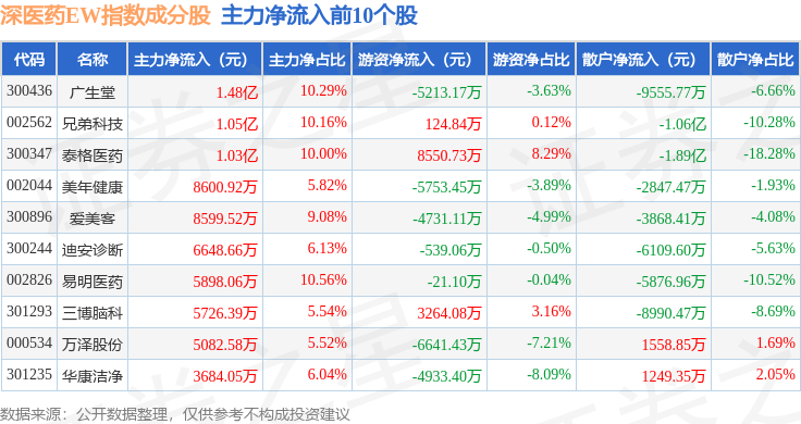 资金流向方面,深医药EW(399676)指数成份股当日主力资金净流入合计3608.22万元,游资资金净流出合计4.92亿元,散户资金净流入合计4.56亿元。成份股资金流向详情见下表: