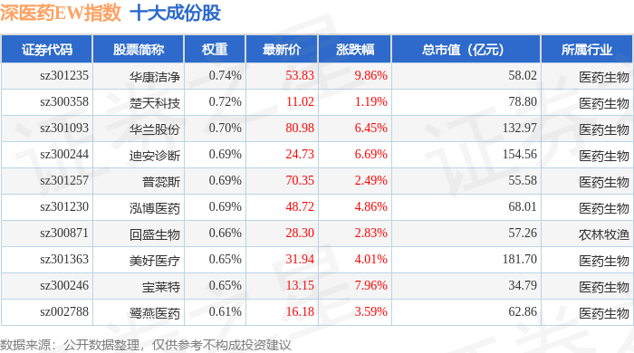 证券之星消息,2月3日,深医药EW(399676)指数报收于3961.31点,涨1.97%,成交454.58亿元,换手率2.06%。当日该指数成份股中,上涨的有207家,万泽股份以10.01%的涨幅领涨,下跌的有11家,双鹭药业以7.1%的跌幅领跌。