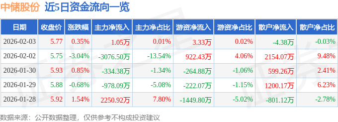 证券之星消息,截至2026年2月3日收盘,中储股份(600787)报收于5.77元,上涨0.35%,换手率1.12%,成交量24.22万手,成交额1.4亿元。
