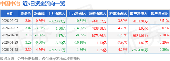证券之星消息,截至2026年2月3日收盘,中国中冶(601618)报收于3.04元,上涨0.66%,换手率1.19%,成交量211.71万手,成交额6.43亿元。
