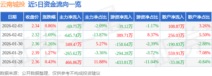证券之星消息,截至2026年2月3日收盘,云南城投(600239)报收于2.34元,上涨0.86%,换手率0.89%,成交量14.29万手,成交额3341.15万元。