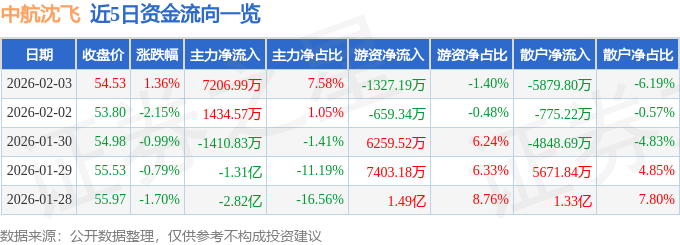 证券之星消息,截至2026年2月3日收盘,中航沈飞(600760)报收于54.53元,上涨1.36%,换手率0.62%,成交量17.5万手,成交额9.5亿元。