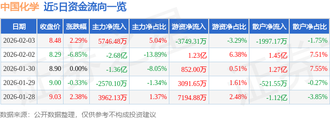 证券之星消息,截至2026年2月3日收盘,中国化学(601117)报收于8.48元,上涨2.29%,换手率2.23%,成交量135.9万手,成交额11.4亿元。