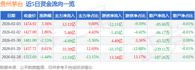 证券之星消息,截至2026年2月3日收盘,贵州茅台(600519)报收于1474.92元,上涨3.36%,换手率0.69%,成交量8.63万手,成交额126.28亿元。