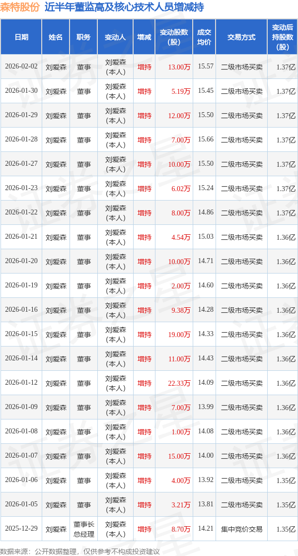 森特股份近半年内的董监高及核心技术人员增减持详情如下: