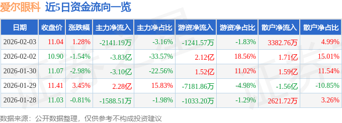 证券之星消息,截至2026年2月3日收盘,爱尔眼科(300015)报收于11.04元,上涨1.28%,换手率0.78%,成交量61.84万手,成交额6.78亿元。