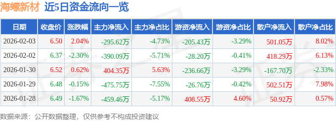 2月3日的资金流向数据方面,主力资金净流出295.62万元,占总成交额4.73%,游资资金净流出205.43万元,占总成交额3.29%,散户资金净流入501.05万元,占总成交额8.02%。