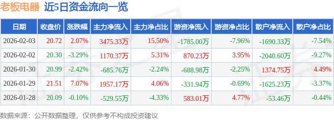 证券之星消息,截至2026年2月3日收盘,老板电器(002508)报收于20.72元,上涨2.07%,换手率1.17%,成交量10.91万手,成交额2.24亿元。