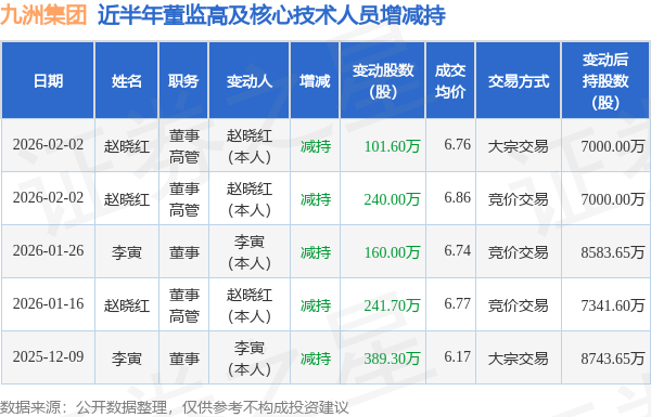 九洲集团近半年内的董监高及核心技术人员增减持详情如下: