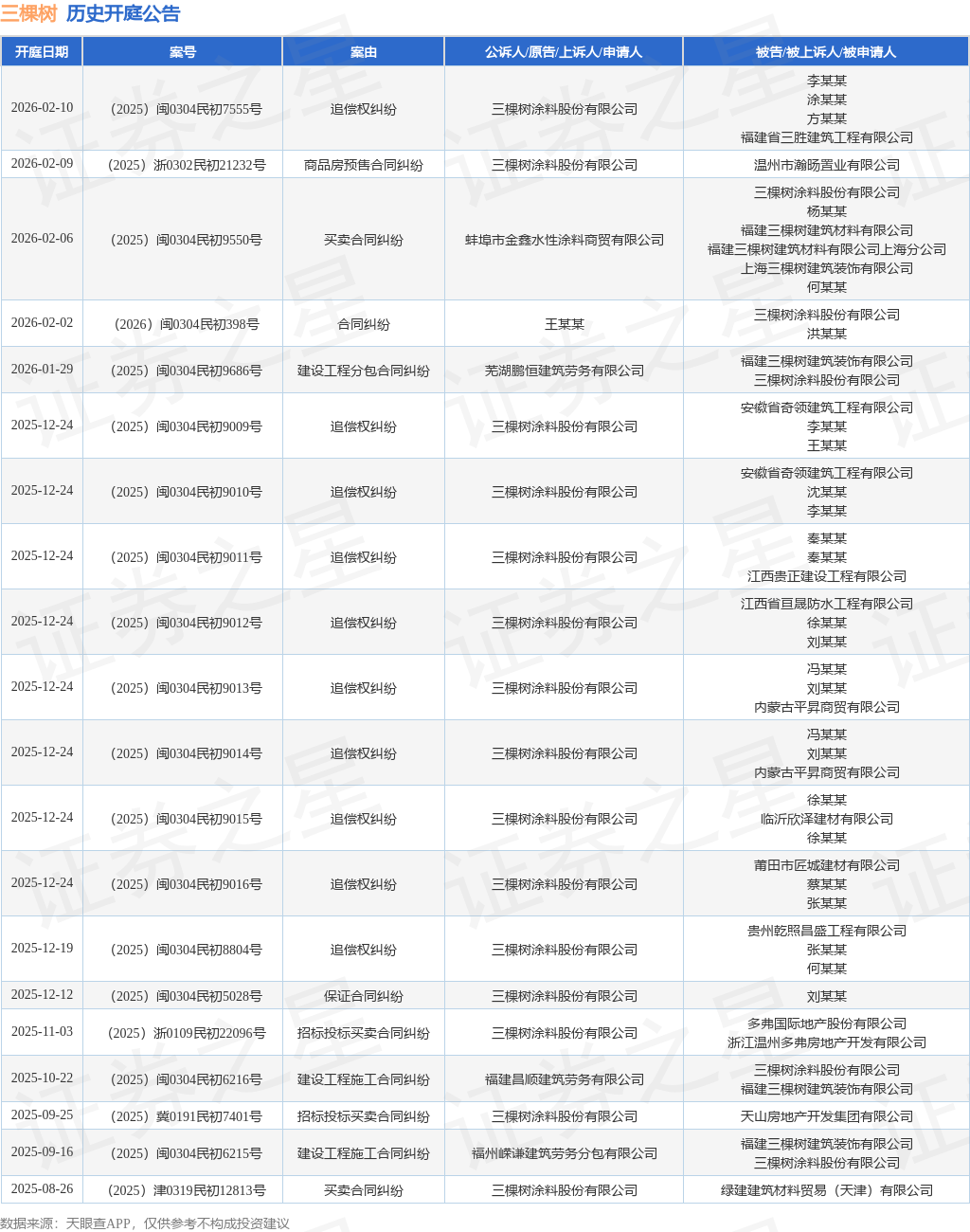 案号:(2025)闽0304民初9550号根据统计,近一年内以三棵树涂料股份有限公司为当事人的历史开庭公告有30则,其中案由为“追偿权纠纷”的公告以12则居首,其次为“买卖合同纠纷”有7则,“建设工程施工合同纠纷”有2则。历史开庭公告(前20条)如下: