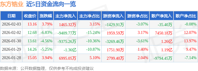 证券之星消息,截至2026年2月3日收盘,东方锆业(002167)报收于13.16元,上涨3.79%,换手率4.76%,成交量36.08万手,成交额4.66亿元。