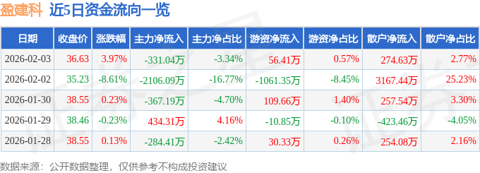 证券之星消息,截至2026年2月3日收盘,盈建科(300935)报收于36.63元,上涨3.97%,换手率4.54%,成交量2.73万手,成交额9917.95万元。