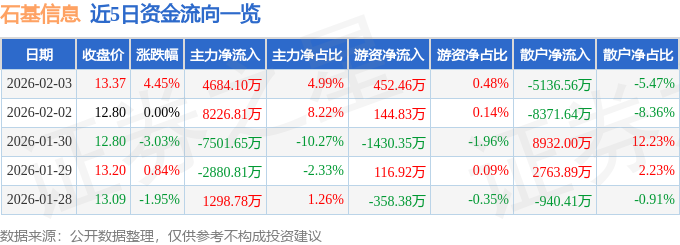 证券之星消息,截至2026年2月3日收盘,石基信息(002153)报收于13.37元,上涨4.45%,换手率4.43%,成交量70.95万手,成交额9.39亿元。