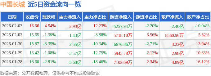 证券之星消息,截至2026年2月3日收盘,中国长城(000066)报收于16.36元,上涨4.54%,换手率4.6%,成交量148.34万手,成交额23.92亿元。
