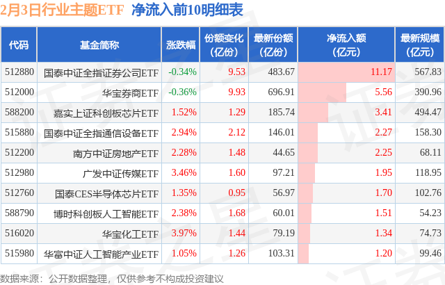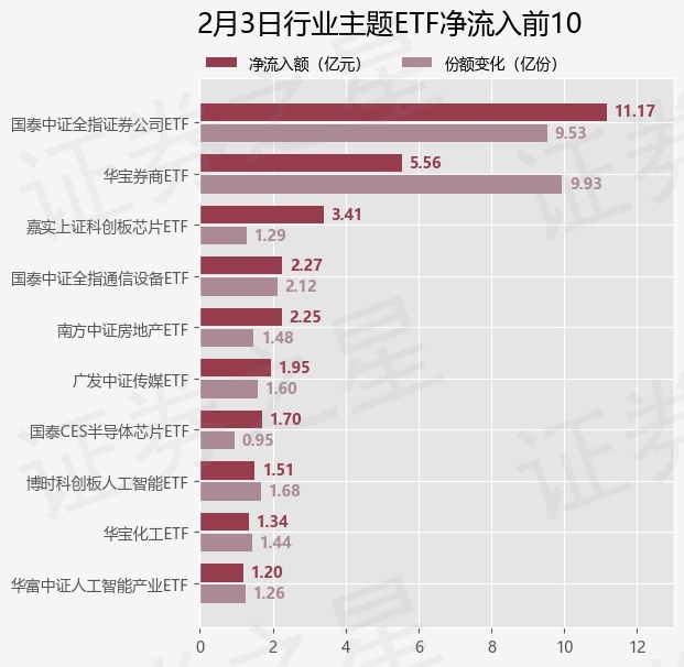 当日有114只行业主题ETF基金出现资金净流入,其中净流入排首位的是国泰中证全指证券公司ETF(512880),份额增加了9.53亿份,净流入额为11.17亿元。