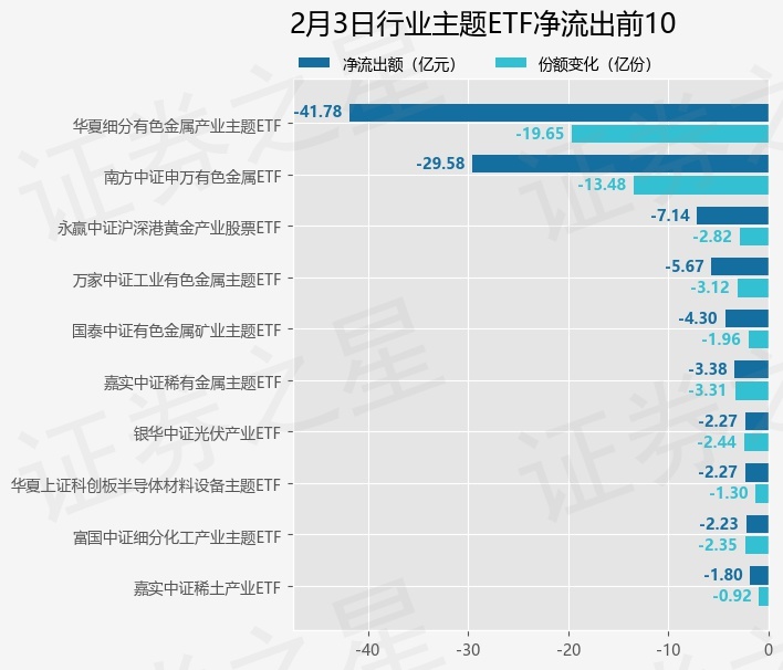当日有138只行业主题ETF基金出现资金净流出,其中净流出排首位的是华夏细分有色金属产业主题ETF(516650),份额减少了19.65亿份,净流出额为41.78亿元。