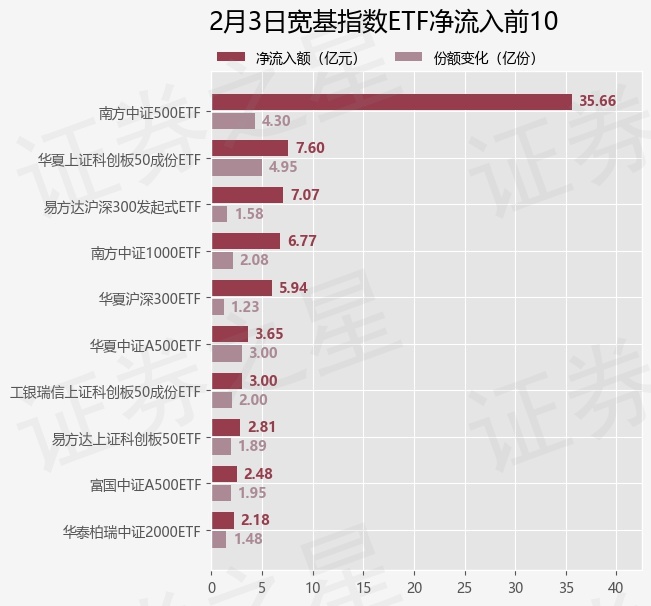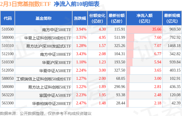 当日有63只宽基指数ETF基金出现资金净流入,其中净流入排首位的是南方中证500ETF(510500),份额增加了4.3亿份,净流入额为35.66亿元。