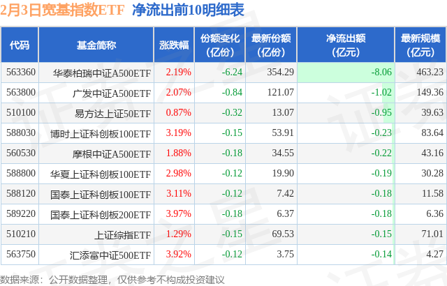 当日有31只宽基指数ETF基金出现资金净流出,其中净流出排首位的是华泰柏瑞中证A500ETF(563360),份额减少了6.24亿份,净流出额为8.06亿元。