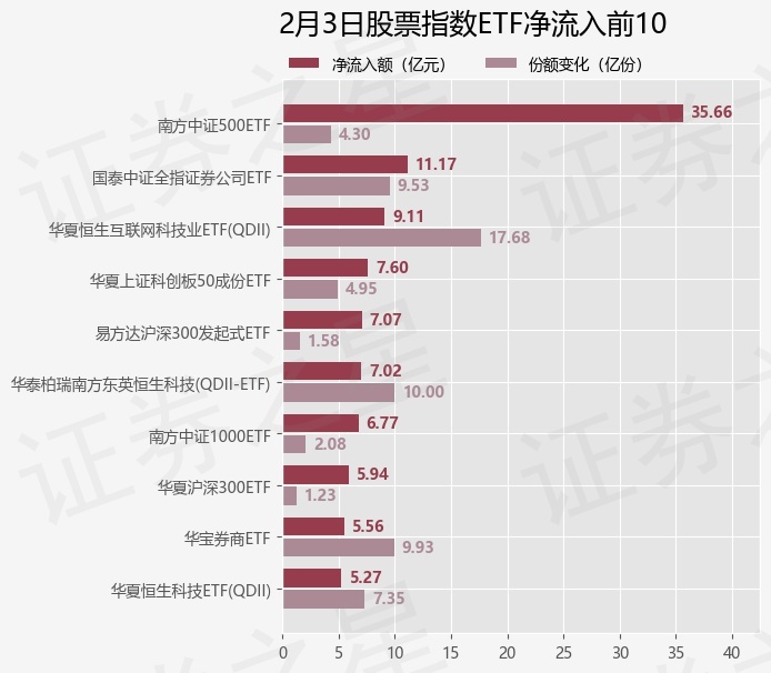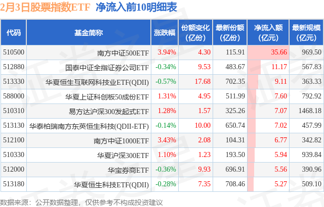 当日有239只股票指数ETF基金出现资金净流入,其中净流入排首位的是南方中证500ETF(510500),份额增加了4.3亿份,净流入额为35.66亿元。