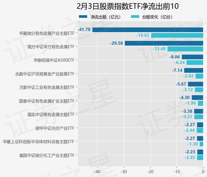当日有205只股票指数ETF基金出现资金净流出,其中净流出排首位的是华夏细分有色金属产业主题ETF(516650),份额减少了19.65亿份,净流出额为41.78亿元。