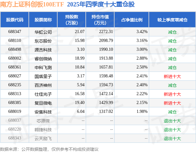 南方上证科创板100ETF基金成立于2023年12月8日,基金经理为朱恒红,基金跟踪标的为上证科创板100指数,成立以来超额回报为1.86%,近一个月超额回报为0.01%。最新披露的基金持仓数据显示,截止2025年12月31日,该基金第一大重仓股为华虹公司(688347),持股占比为3.42%。