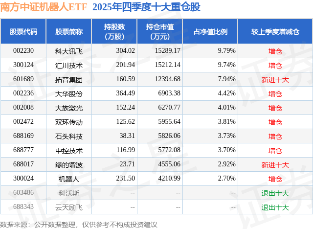 南方中证机器人ETF基金成立于2025年7月24日,基金经理为潘水洋,基金跟踪标的为中证机器人指数,成立以来超额回报为-2.48%,近一个月超额回报为-0.04%。最新披露的基金持仓数据显示,截止2025年12月31日,该基金第一大重仓股为科大讯飞(002230),持股占比为9.79%。