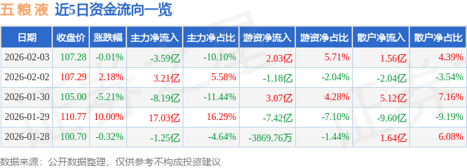 证券之星消息,截至2026年2月3日收盘,五 粮 液(000858)报收于107.28元,下跌0.01%,换手率0.85%,成交量33.16万手,成交额35.57亿元。