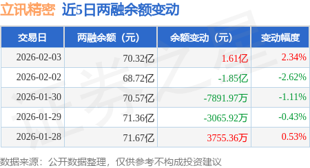 证券之星消息,2月3日,立讯精密(002475)融资买入5.34亿元,融资偿还3.74亿元,融资净买入1.6亿元,融资余额70.13亿元,当日融资净买入排名第26,近20个交易日中有11个交易日出现融资净买入。