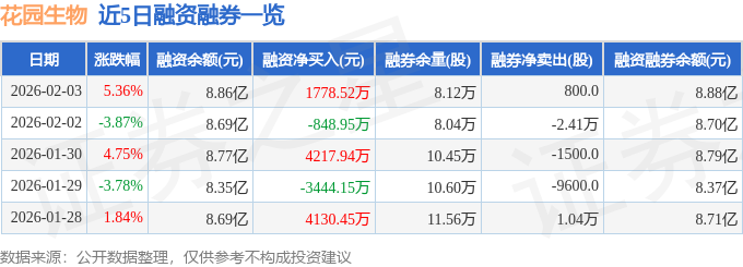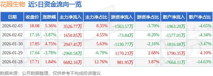 证券之星消息,截至2026年2月3日收盘,花园生物(300401)报收于18.08元,上涨5.36%,换手率4.43%,成交量23.7万手,成交额4.22亿元。