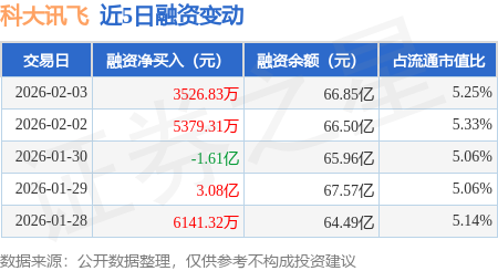 证券之星消息,2月3日,科大讯飞(002230)融资买入5.81亿元,融资偿还5.46亿元,融资净买入3526.83万元,融资余额66.85亿元,近20个交易日中有13个交易日出现融资净买入。