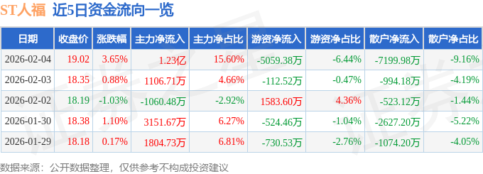证券之星消息,截至2026年2月4日收盘,ST人福(600079)报收于19.02元,上涨3.65%,换手率2.69%,成交量41.55万手,成交额7.86亿元。