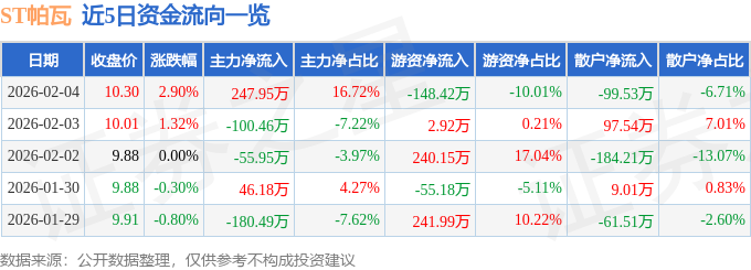 证券之星消息,截至2026年2月4日收盘,ST帕瓦(688184)报收于10.3元,上涨2.9%,换手率1.46%,成交量1.47万手,成交额1482.84万元。
