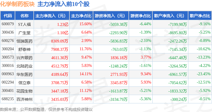 从资金流向上来看,当日化学制药板块主力资金净流入3982.75万元,游资资金净流入1.5亿元,散户资金净流出1.9亿元。化学制药板块个股资金流向见下表: