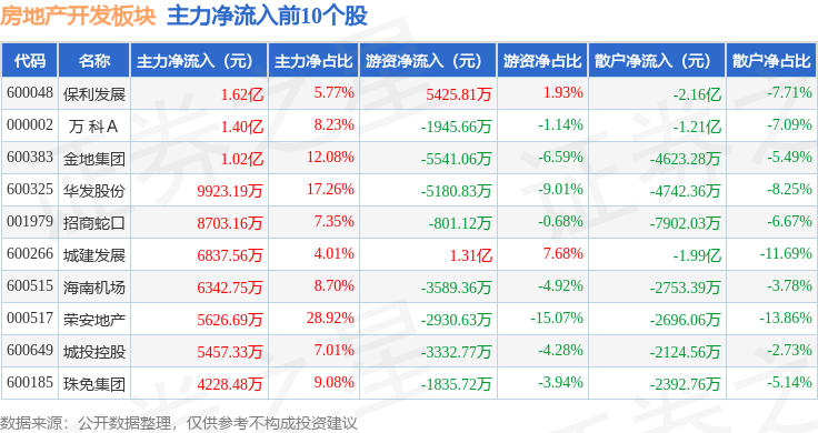 从资金流向上来看,当日房地产开发板块主力资金净流入5.97亿元,游资资金净流出2.56亿元,散户资金净流出3.41亿元。房地产开发板块个股资金流向见下表: