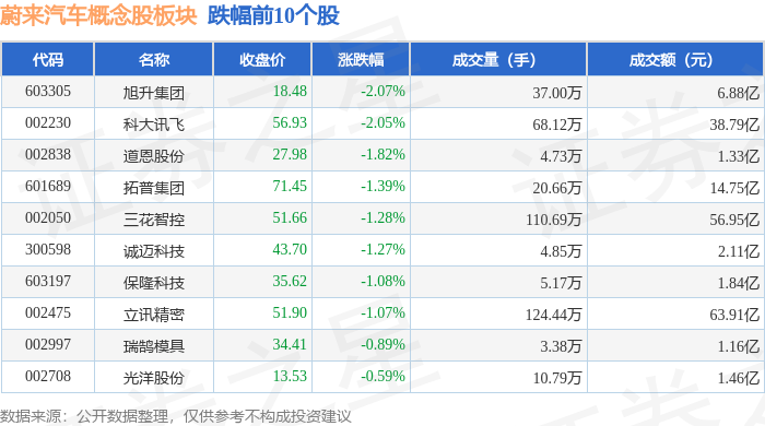 从资金流向上来看,当日蔚来汽车概念股板块主力资金净流出18.67亿元,游资资金净流入6.43亿元,散户资金净流入12.24亿元。蔚来汽车概念股板块个股资金流向见下表: