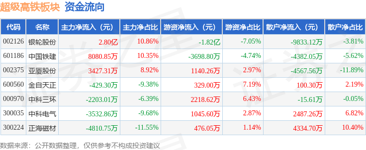从资金流向上来看,当日超级高铁板块主力资金净流入2.86亿元,游资资金净流出1.67亿元,散户资金净流出1.19亿元。超级高铁板块个股资金流向见下表: