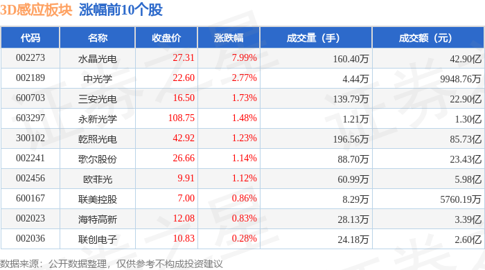 证券之星消息,2月4日3D感应板块较上一交易日上涨0.19%,水晶光电领涨。当日上证指数报收于4102.2,上涨0.85%。深证成指报收于14156.27,上涨0.21%。3D感应板块个股涨跌见下表: