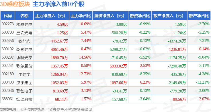 从资金流向上来看,当日3D感应板块主力资金净流出4.38亿元,游资资金净流出64.65万元,散户资金净流入4.39亿元。3D感应板块个股资金流向见下表: