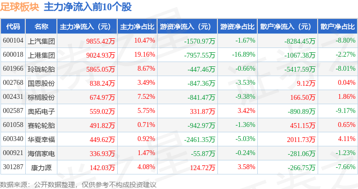 从资金流向上来看,当日足球板块主力资金净流出4742.06万元,游资资金净流出1.01亿元,散户资金净流入1.48亿元。足球板块个股资金流向见下表: